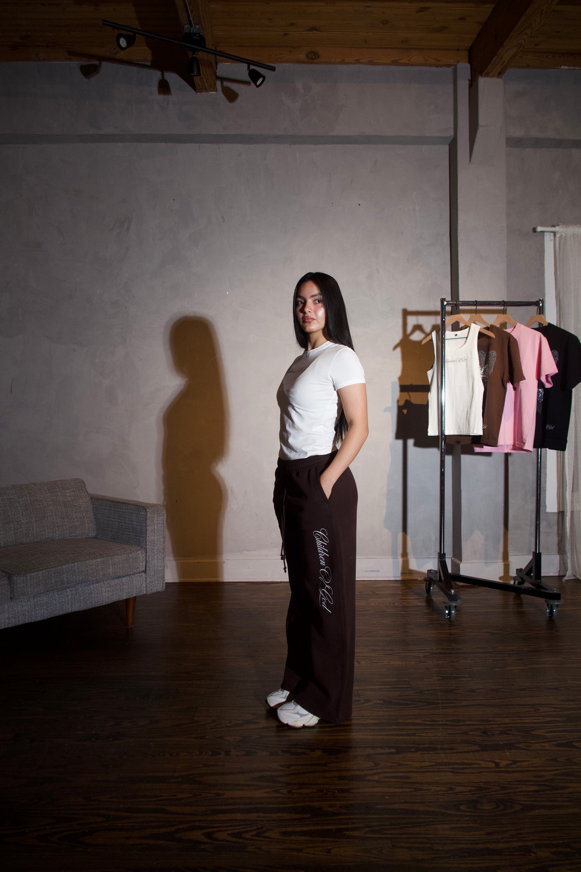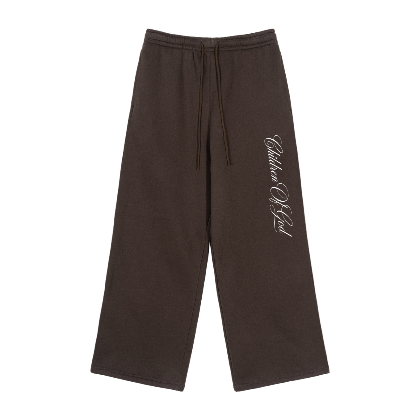 A pair of baggy sweatpants featuring a direct to garment print on the front left thigh and Romans 8:14 on the back.
